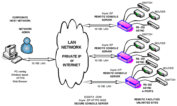 Async2IP는 10/100 LAN을 통해 최대 4개의 비동기 원격 콘솔 시리얼 포트를 중앙 네트워크 제어 사이트에 있는 터미널의 시리얼 포트에 연결하는 보안 원격 콘솔 액세스 제품입니다.