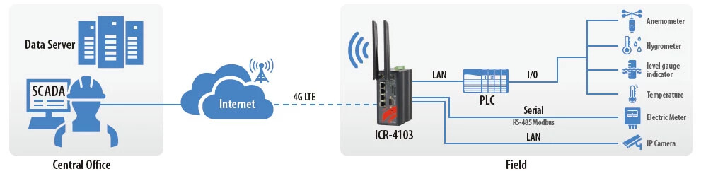 ICR-4103 셀룰러 라우터는 WAN, LAN, SIM, VPN, 방화벽, 내장 DI/DO 및 직렬 포트 서비스와 통합됩니다. 또한 ICR-4103은 가장 까다로운 환경에서 연결을 위해 최고 수준의 산업 등급 설계를 사용하며 원격 제어 및 모니터링, 버스 티켓 수집 시스템, CCTV, SCADA, 디지털 사이니지, 키오스크 및 지능형 교통 시스템과 같은 산업용 사물 인터넷(IIoT) 및 M2M 애플리케이션에 이상적인 솔루션입니다. .