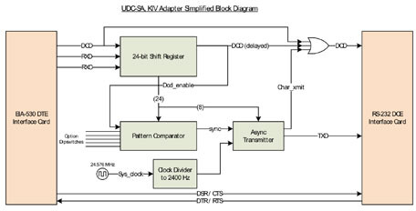 UDC-SA, KIV 시리얼 어댑터는 1200bps로 작동하는 동기식 RS-530 DCE에서 수신된 단방향 시리얼 메시지를 2400baud의 RS-232 비동기식 DTE로 전송하도록 설계된 인터페이스 어댑터입니다.