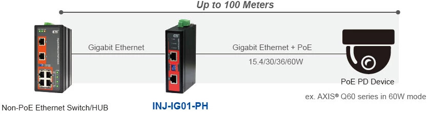 INJ-IG01-PH는 산업용 등급의 단일 포트 기가비트 이더넷 PoE 인젝터입니다. 원래 IEEE 802.3af-2003 PoE 표준은 각 장치에 최대 15.4W의 DC 전원을 제공합니다. PoE+ 또는 PoE plus라고도 하는 업데이트된 IEEE 802.3at-2009 PoE 표준은 최대 30W의 전력을 제공합니다. 또한 INJ-IG01-PH는 4쌍의 카테고리 5 케이블을 모두 비표준으로 사용하여 최대 36/60W를 제공할 수 있습니다.