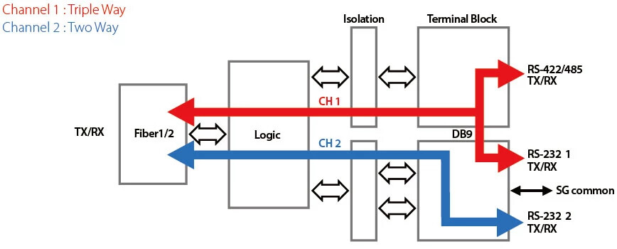 IFC-FDC 컨버터는 RS-232(3선), RS-485(2선, 반이중) 또는 RS-422/485(4선, 전이중) 연결을 위한 인터페이스 모드를 선택할 수 있으며 3방향 통신과 두 번째 독립 RS-232 통신 채널을 갖추고 있습니다. 또한 터미널 블록은 알람 릴레이 접점과 2개의 중복 DC 전원 입력을 제공합니다.