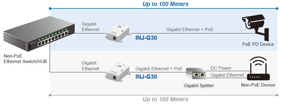 이 장치는 1개의 PoE 인젝터 포트로 구성됩니다. 전원 콘센트 위치의 제한을 해결할 수 있고 시스템 설계자에게 PD 네트워크 장치를 어디에나 배치할 수 있는 유연한 솔루션을 제공할 수 있습니다.