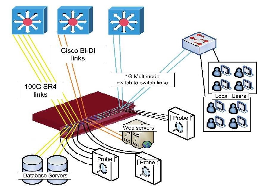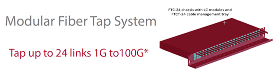 Two LC connector pairs per module for Tap connections to network link endpoints (MTP connectors used for SR4 and 100G modules) |