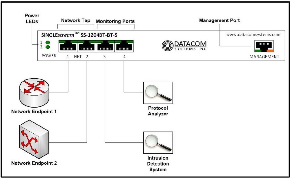 | SS-1204BT-BT-S | SINGLEstream™ 10/100/1000 Link Aggregation Tap with 2 Any-to-Any Monitoring ports with SSH, SNMP |