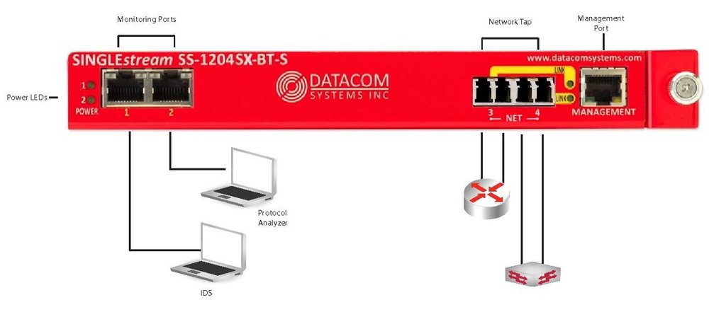 | SS-1204SX-BT-S | SINGLEstream™ 10/100/1000 Link Aggregation Tap with 2 Any-to-Any (RJ45) Monitoring ports with SSH, SNMP (specify 50 or 62.5 micron) |
