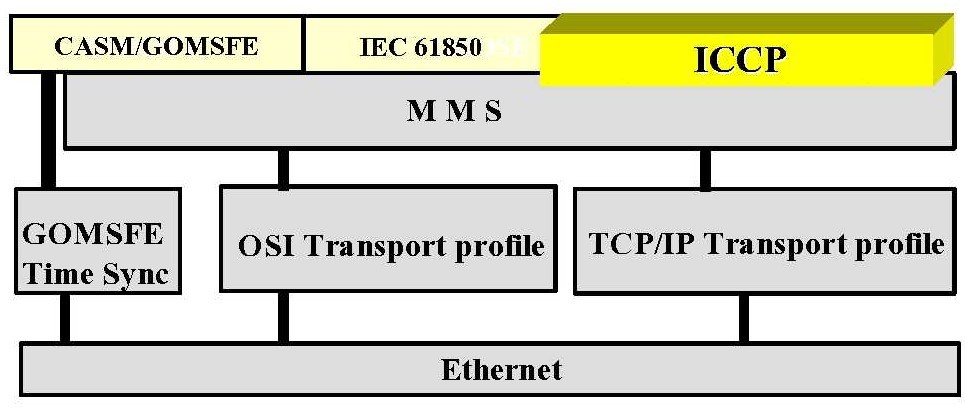 - 프로토콜 계층: Raw(이더넷), 링크, 네트워크, 전송, 세션, 프리젠테이션, MMS, ICCP 적합성 블록 1-2-4-5-8(서비스, 개체 및 시맨틱)