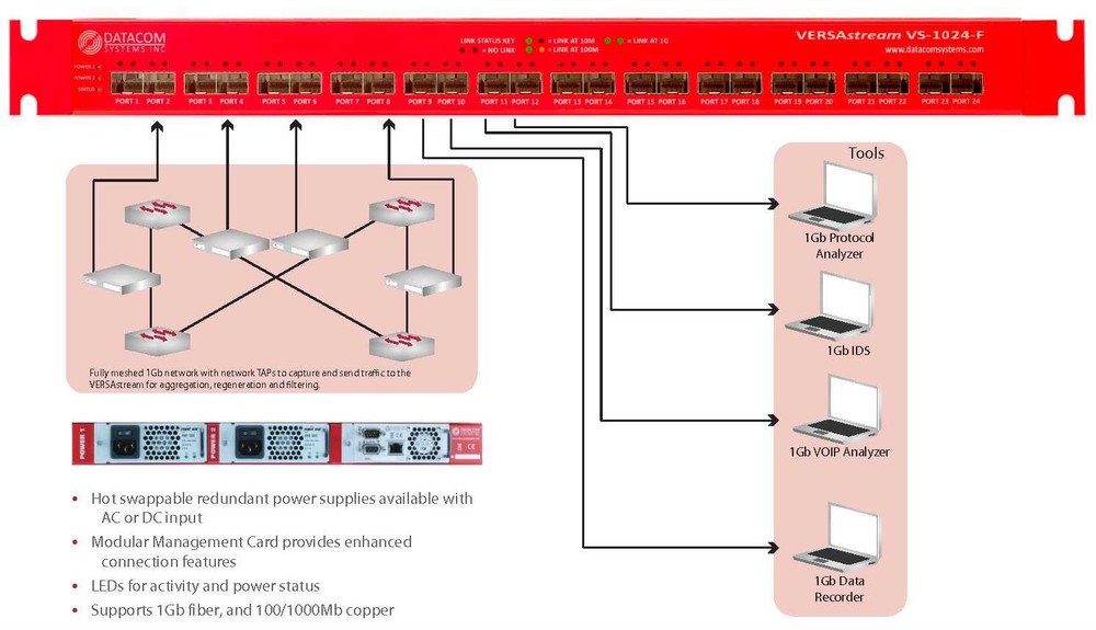 | VS-1024-F | VERSAstream™ 24 Port 1G Network Monitoring Switch. Rack mount ears included. |