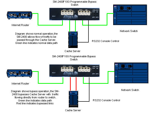 SM-2400F10G 프로그래밍 가능 바이패스 스위치는 오작동하는 네트워크 장비를 자동으로 바이패스하는 기능을 제공합니다. 이 장치는 직렬통신 링크를 통해 올바르게 작동하는 네트워크 장치와 주기적으로 상호 작용할 수 있는 지능형 감시 장치로 작동합니다.