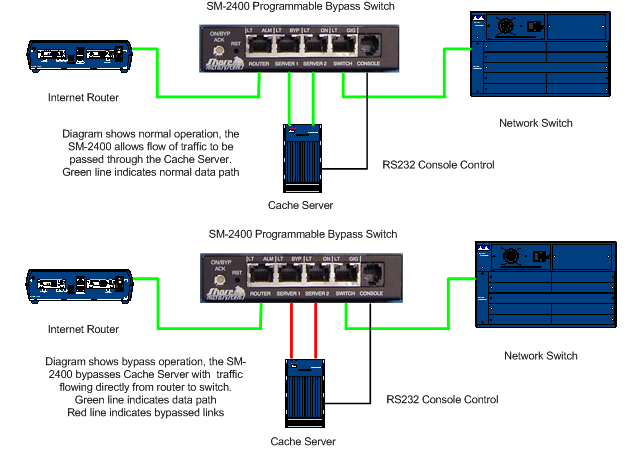 SM-2400 프로그램 가능 바이패스 스위치는 오작동하는 네트워크 장비를 자동으로 바이패스 할 수 있는 기능을 제공합니다. 이 장치는 직렬통신 링크를 통해 올바르게 작동하는 네트워크 장치와 주기적으로 상호 작용할 수 있는 지능형 감시장치로 작동합니다.