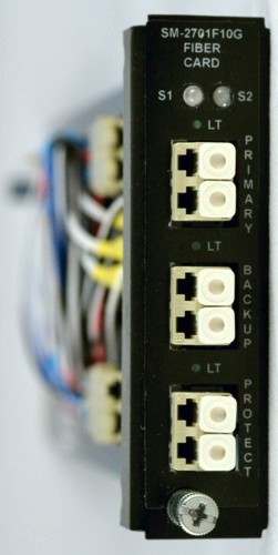 SM-2701F10G 광섬유 포트 카드는 기본, 백업 및 보호된 10GBaseSR 이더넷 포트에 연결하기 위한 3개의 LC 스타일 이중 커넥터를 제공합니다. 싱글모드 버전은 특별 주문으로 제공됩니다.