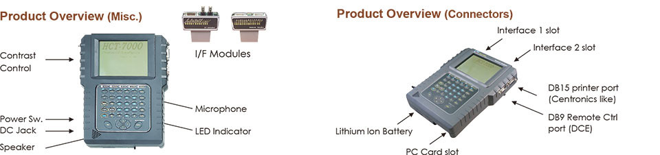 HCT-7000에는 백라이트 LCD(Liquid Crystal Display), 푸시버튼 스위치 키보드, 인터페이스 리드 표시기 LED, 사용자 교체 가능 데이터 포트 인터페이스 모듈 및 내장 충전식 리튬 이온 배터리가 있습니다.