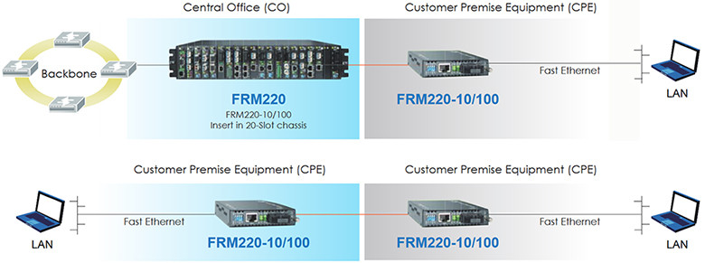 자동 협상을 선택하면 IEEE802.3u 표준에 따라 반이중 및 전이중 신호를 모두 변환하도록 자동으로 조정됩니다. LED 표시기는 컨버터의 전원 상태, UTP 포트 속도, 링크 및 이중 상태, FX 포트 링크 및 이중 상태를 나타냅니다. 이러한 비관리형 독립형 변환기는 FRM220-CH20 또는 FRM220-CH08 관리형 섀시에 집중될 수도 있습니다.