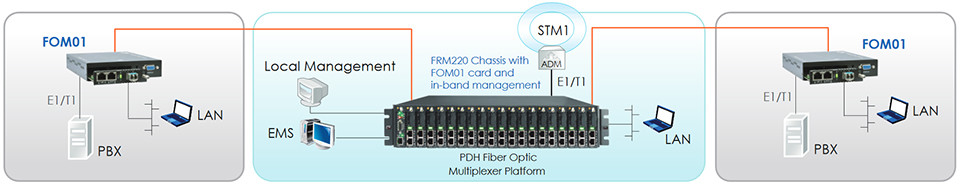 FRM220-FOM01은 추가 회선속도 100M 이더넷 트렁크와 클리어 채널 RS-232가 있는 단일 채널 E1/T1 파이버 멀티플렉서로 FRM220 시리즈를 배치 할 수 있습니다.