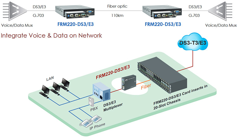 FRM220-DS3/E3은 광섬유를 통해 DS3, E3 또는 STS-1 전송을 투명하게 확장하기 위해 쌍으로 작동하는 광섬유 모뎀입니다. 플러그형 SFP트랜시버(155Mbps)를 사용함으로써 멀티모드 또는 싱글모드 광섬유, 최대 120km거리 또는 BiDi(WDM) SFP모듈을 사용하는 단일 코어 광섬유에 쉽게 배포할 수 있습니다.