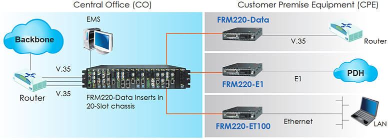 FRM220-Data 파이버 모뎀은 Nx64K 전송을 위해 FRM220-E1/T1과 페어링될 수도 있습니다. 단일 슬롯 섀시에 배치하고 관리없이 독립형으로 사용되는 경우 DIP 스위치로 카드를 구성할 수 있습니다.