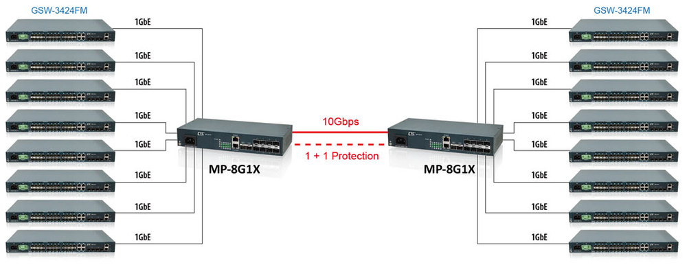 MP-8G1X는 8x 1GE~10G Muxponder입니다. Muxponder는 TDM 기술을 기반으로 8개의 개별 Gigabit Ethernet 데이터 스트림을 1-2 보호 모드의 10Gbps SFP⁺ 기반 트렁크 포트로 전송합니다.
