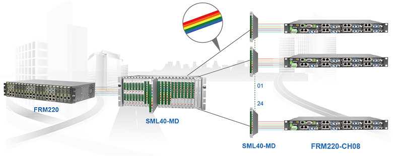 SML-40-MD80은 1471nm, 1491nm, 1511nm, 1531nm, 1551nm, 1571nm, 1591nm, 1611nm를 포함한 CWDM 파장용 8채널 MUX/DeMUX 모듈식 디자인 카드입니다.