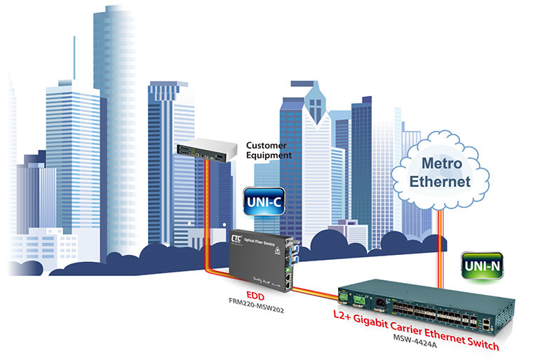 MSW-4424A layer 2+ 관리형 Gigabit Ethernet 스위치는 Carrier Ethernet 액세스 스위치 솔루션으로 배치됩니다.