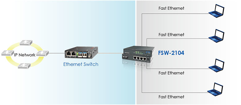FSW-2104는 비관리형 이더넷 파이버 스위치를 위한 저렴한 솔루션을 제공합니다. FSW-2104는 4포트 10/100Base-TX 및 1포트 100Base-FX 고속 이더넷 스위치입니다. FSW-2104는 건물, 사무실 또는 캠퍼스내 등의 백본에 장거리 연결이 필요한 소규모 작업 그룹 응용프로그램을 위해 설계되었습니다.
