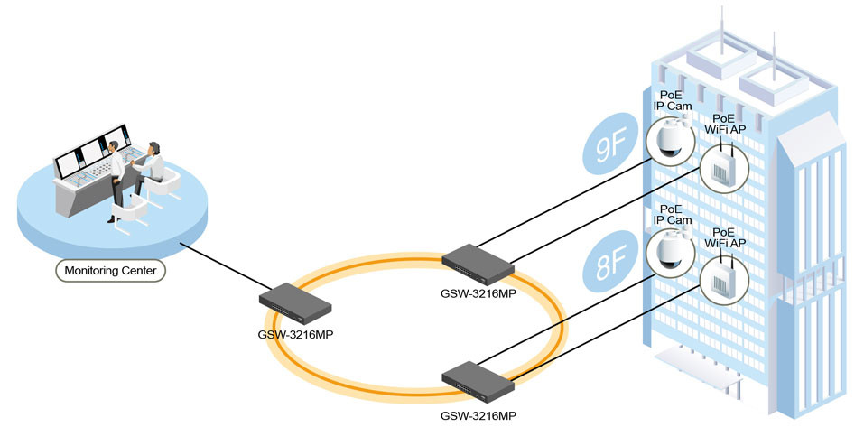 GSW-3216MP는 IEEE 802.3af 및 802.3at를 준수합니다. 16x 10/100/1000Mbps TX 포트는 PoE 지원 장치를 연결하기 위해 최대 15.4 또는 30W의 전력을 제공하도록 선택 가능합니다.