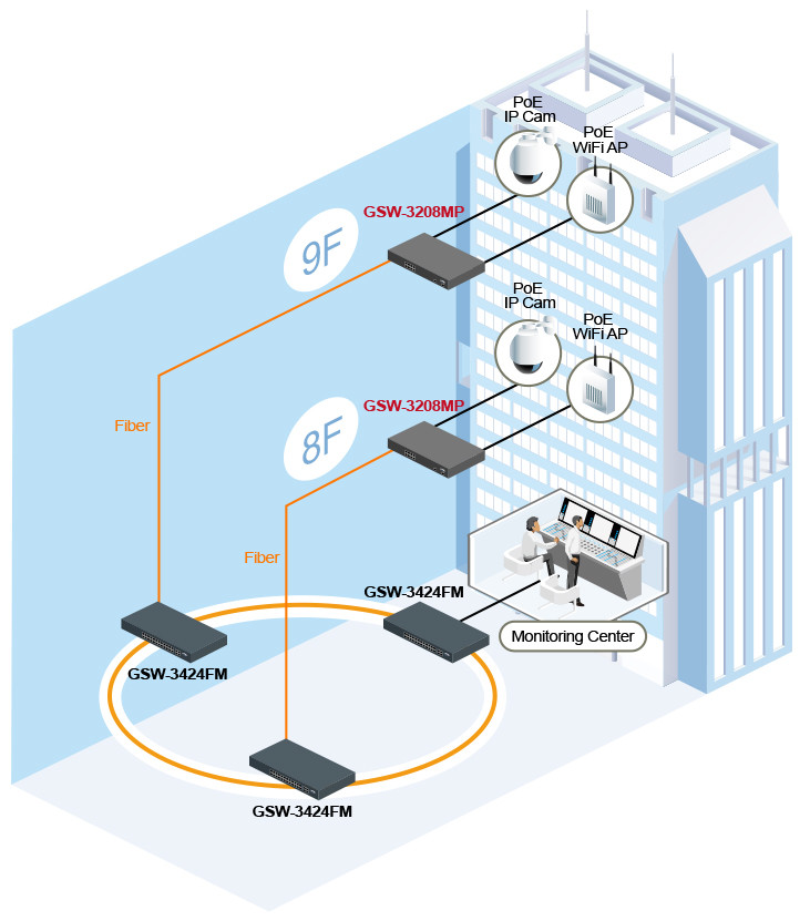 GSW-3208MP는 8x 10/100/1000Mbps TX 포트와 2x SFP 포트가 있는 비용효율적인 고성능 기가비트 L2 PoE+ 스위치입니다. SNMP, Http/Https 또는 Telnet/SSH에 의한 원격 관리 및 콘솔 인터페이스에 의한 로컬 관리를 지원하고, CLI 명령을 사용하여 일부 기본 설정에 대해 콘솔 인터페이스가 지원됩니다.