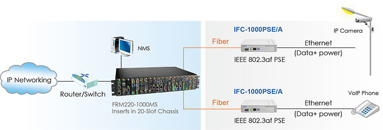 IFC-1000PSE는 외부 AC 전원 어댑터 또는 내부 AC 전원이 내장된 IEEE802.3af PoE 표준을 준수합니다. TP 링크를 통해 수신 된 데이터를 48VDC 전원과 결합하여 기존 CAT5 UTP 케이블을 통해 IEEE802.3af 전원 장치(PD)에 전원을 공급하는 PSE (Power Sourcing Equipment)입니다.