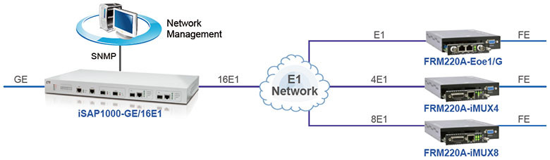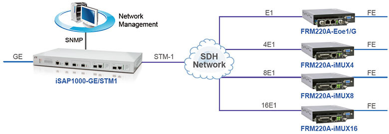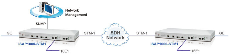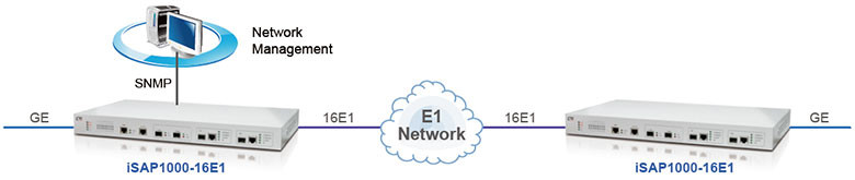 iSAP1000은 콘솔 및 SNMP를 통한 다양한 관리 액세스를 지원합니다. iSAP1000은 16x E1 또는 2x STM-1 파이버 인터페이스가 있는 2개의 기가비트 콤보 포트(2포트 10/100/1000Base-T 및 2 포트 1000Base-X SFP 슬롯)를 제공합니다. 두개의 GE 콤보 포트는 링크 집계, 포트 기반 VLAN 및 802.1Q VLAN 기능을 지원합니다.