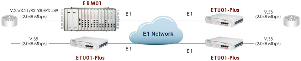 ETU01-Plus는 데이터 채널을 사용자가 선택한 타임 슬롯의 E1 링크에 패킹합니다. ETU01-Plus 전면 패널은 CSU 및 DSU 상태를 모니터링하기 위한 상태 LED와 BERT가 통합된 로컬 및 원격 루프백을 시작하기 위한 푸시 버튼 스위치입니다. ETU01-Plus에는 고정된 온보드 V.35 인터페이스가 있습니다.