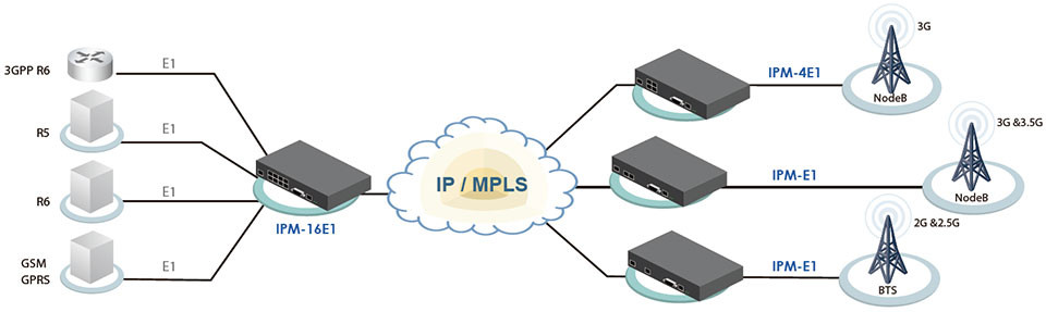 IPM-8E1 및 IPM-16E1은 PDH over IP 응용프로그램을 위한 멀티서비스 액세스 플랫폼으로 설계되었습니다. E1 프레임은 IP 패킷과 매핑/디맵핑될 수 있습니다. E1(ITU-T G.823) 지터 성능을 지원하기 위해 Ingress PDH(PSN->TDM) 클록 생성을 위한 적응형 클록 복구 방법이 구현되었습니다.