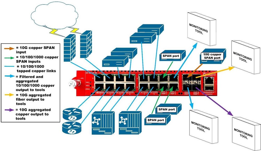 | SS-G6C4C4S | Six (6) copper taps (2 ports per tap), four (4) copper 10/100/1000-BT and four (4) SFP+ Any-to-Any ports |